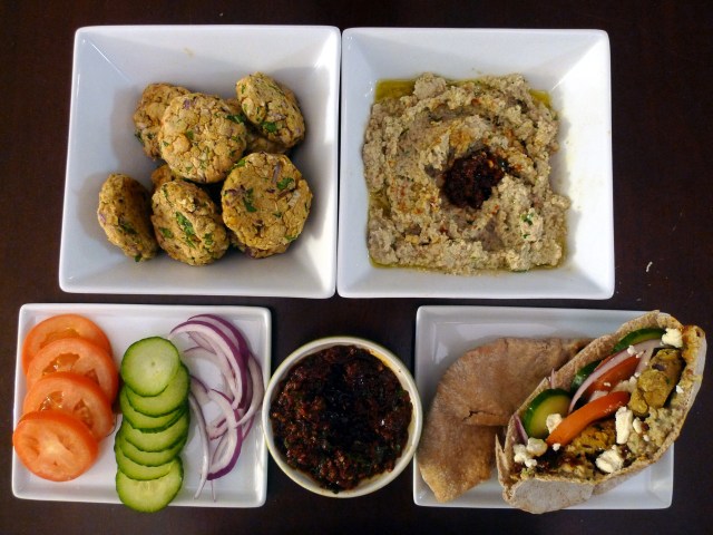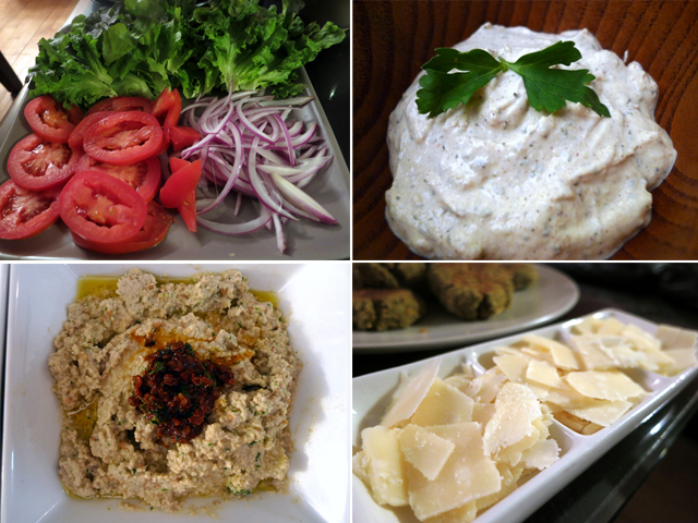 The first time I made falafels years ago, I had fried them in a skillet with a little oil. While I love that pan-fried crisp texture, I very much prefer the baked version nowadays. For my friend’s Mediterranean-themed dinner, I decided to recreate my favorite falafel sandwich from Crisp called the “Crisp Mediterranean” which is served with eggplant, sun-dried tomato spread, Parmesan flakes and garden greens in a warm pita pocket. We made Baba Ghanoush, Sun-Dried Tomato Spread, and Tahini Yogurt and assembled our sandwiches with pita, Parmesan flakes, tomatoes, cucumbers, red onions, and lettuce.