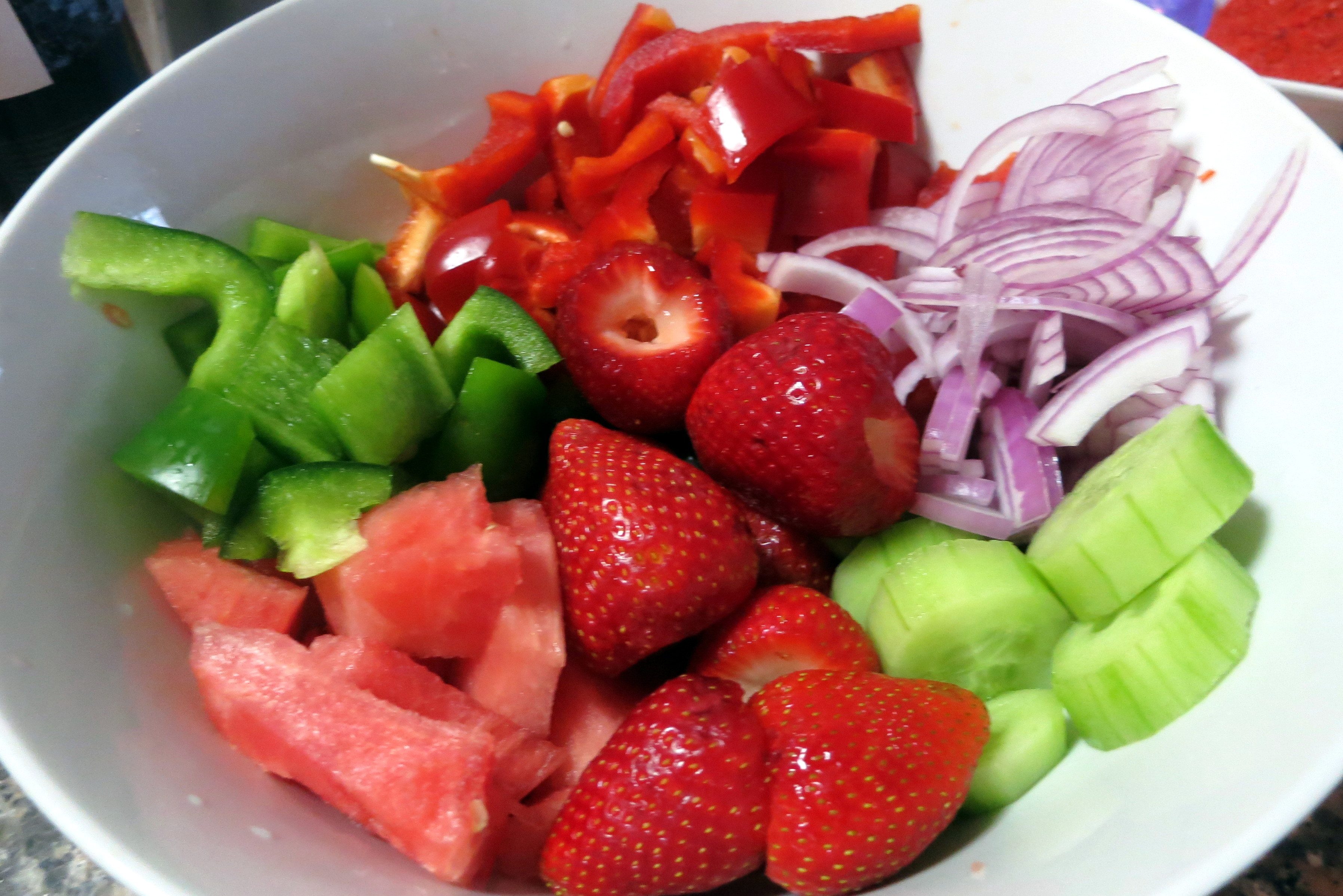In a food processor or a blender, combine tomatoes, strawberries, watermelon, peppers, cucumber, onion, garlic, and jalapeno and blend as smoothly as possible. This may be done in several batches. After processing, pass the mixture through a strainer into a large bowl. Make sure to press firmly, pressing all of the liquid from the pulp.