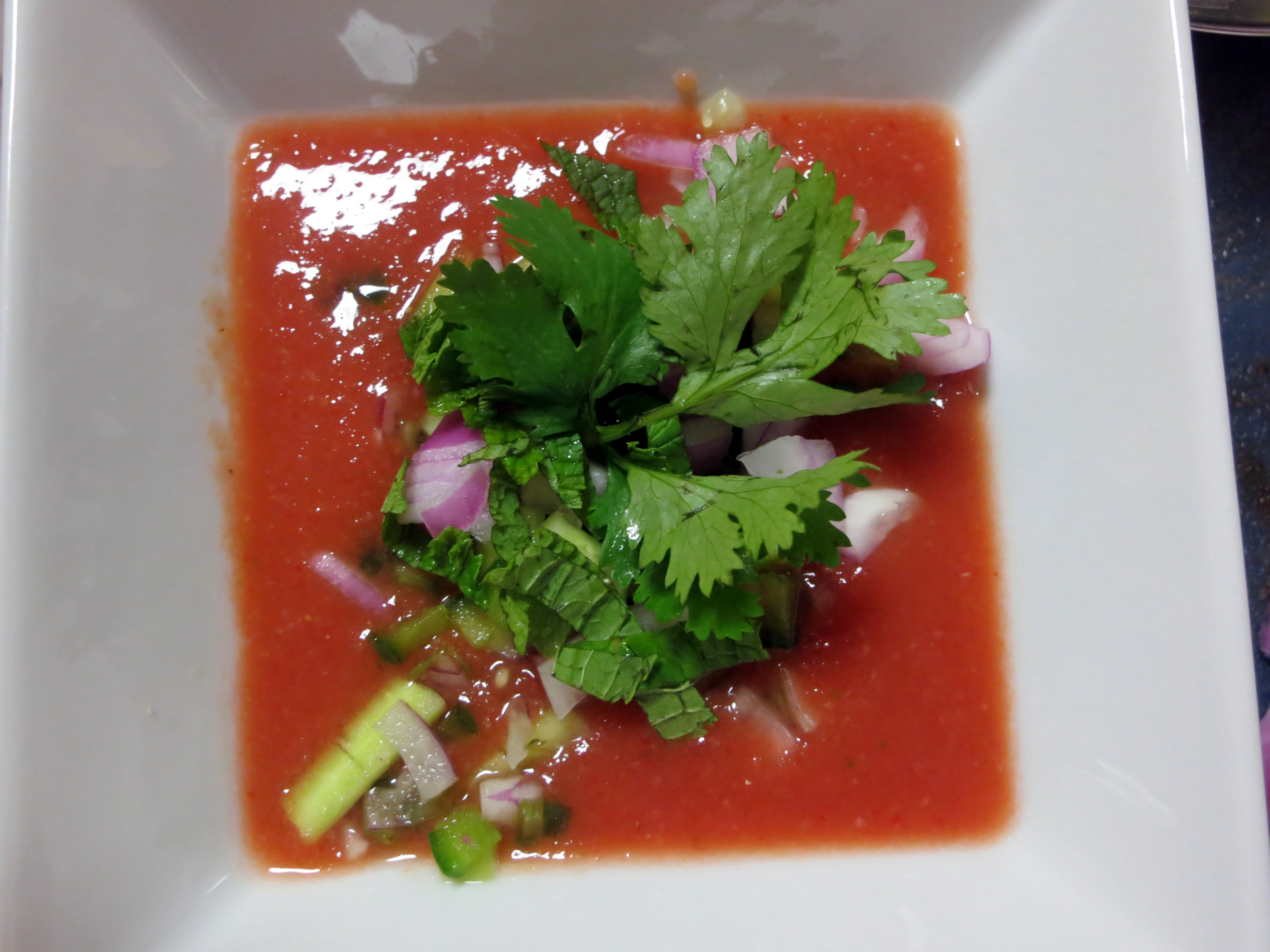 I’ve been trying to figure out what has incepted the gazpacho theme in my brain. At first it was Jen wanting to try something new. So I did by making White Gazpacho. Then I thought it was probably the fact that it is summer and thus the season for chilled soups. But I think ultimately it was Samuel L. Jackson in the Siri commercial with his “yes, unless you want Hotspacho” wittiness. Regardless of reason, I’ve been researching gazpacho recipes to find something that would make a refreshing appetizer without being too heavy. Some of the recipes I saw use bread or even mayonnaise and so I really wanted to skip on those ingredients without sacrificing flavor. I finally found Emeril’s Spanish Style Gazpacho which incorporated watermelon and strawberries. I didn’t mind the extra added sweetness and if anything the soup could have also been a good palate cleanser between other courses. I served the gazpacho as a starter at my Memorial Day Dinner.