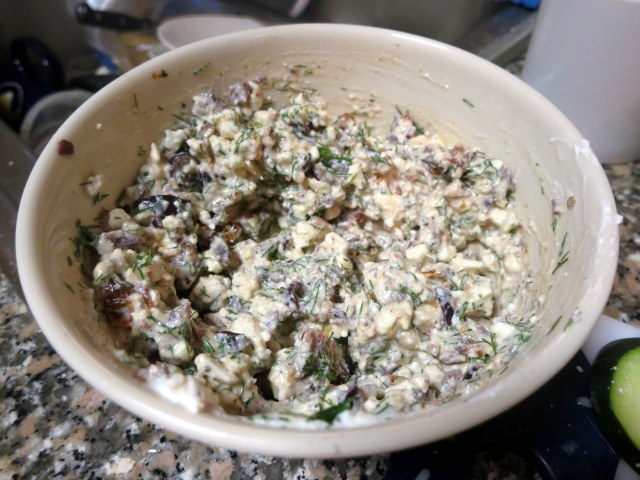 Jen and I have recently been getting recipe ideas from Pinterest, which is where this little gem comes from. I made this appetizer for a friend’s dinner party, which almost felt like cheating because of how easy and quick it is to make (especially since our friend Iv had been laboring in the kitchen for hours). This recipe is very flexible and you can stuff the cucumber slices with just about anything. I followed the recipe I found online and just added garlic (we are obsessed with garlic), but feel free to experiment!