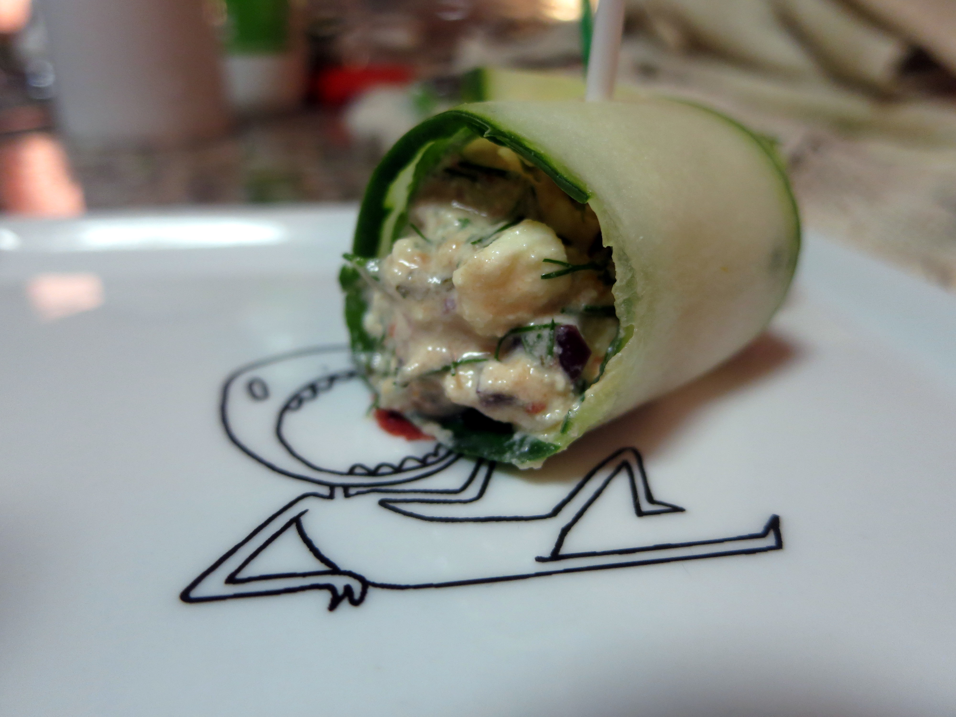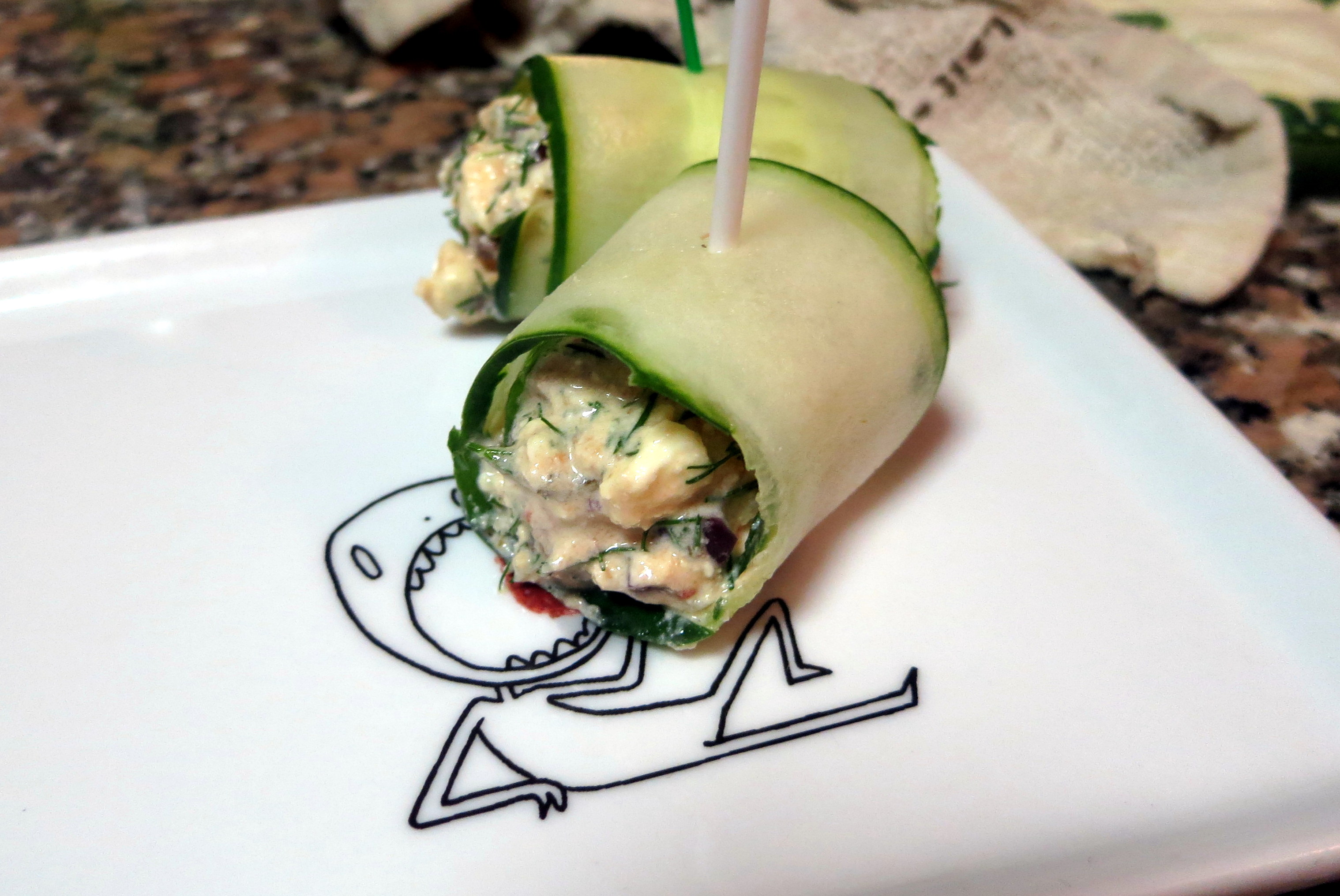 Place 1 – 2 teaspoons of mixture at one end of a cucumber strip and roll up. Secure with a toothpick. Repeat with remaining strips. If not serving immediately, chill until ready to serve.