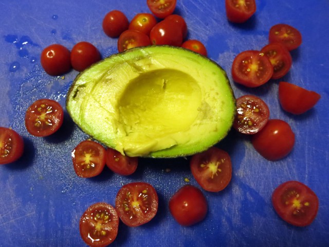 Add all to a bowl with the chickpeas. If the quinoa has cooled down, add as well. Add the tomatoes, avocado, and the dressing (just mix all the ingredients above together). Let cool in fridge for 10-15 minutes before serving.
