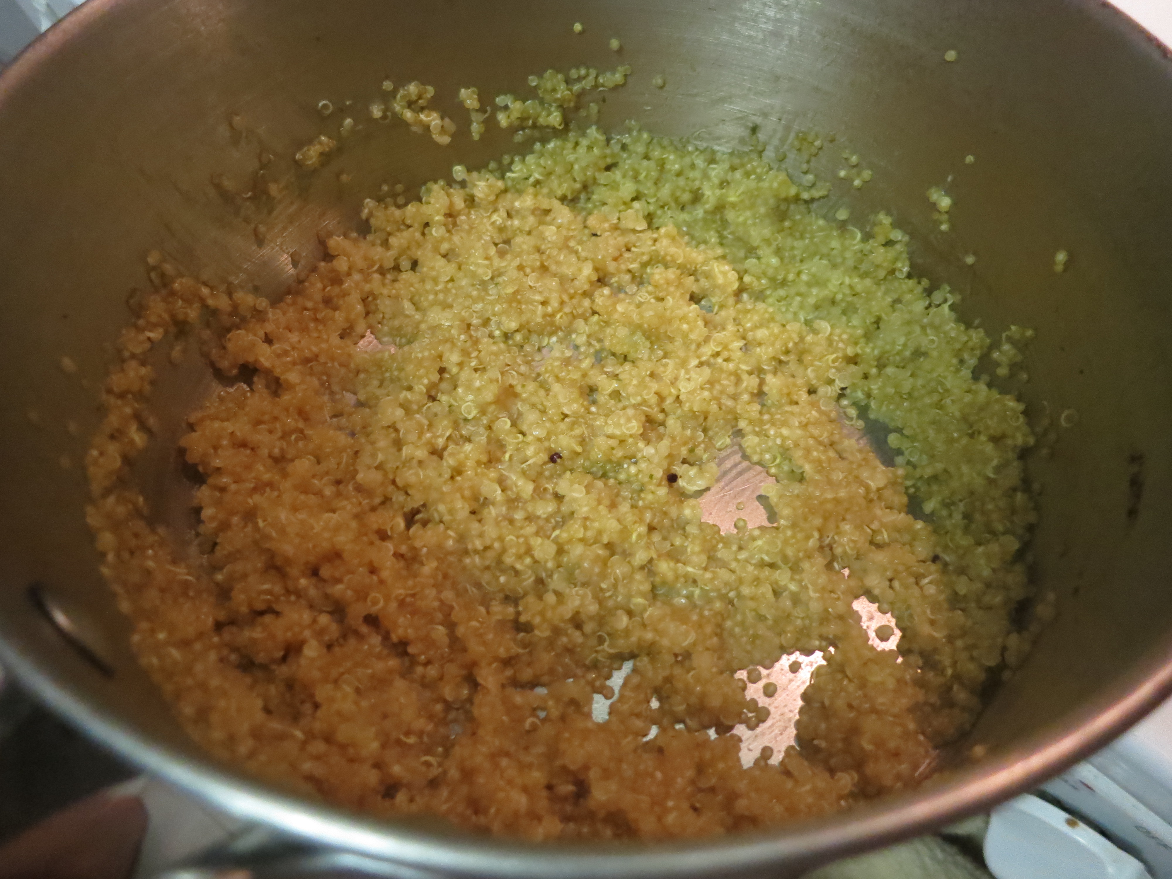 First cook the quinoa. Actually, first rinse it; there is a bitter protective coating on it called saponin which is usually rinsed off before the quinoa is packaged, but who knows where your quinoa has been… There are several methods I’ve seen suggested for the cooking. Some say toast the quinoa first to get the nutty flavors to expand and then boil/simmer. Other recipes just go straight to boiling/simmering. Still others suggest to let the quinoa soak for a bit. Tori spearheaded Operation Quinoa by rinsing it, putting it in a pot with chicken stock (aka bouillon), letting it boil, then simmering, and letting the liquid absorb, leaving just a bit in the pot so the quinoa does not dry out. The rule of thumb is 2 cups of liquid per cup of quinoa and other than that, I think it’s fine to just go to town and let it cook without all the other fancy steps, especially for a salad like this, where the quinoa will not be in the spotlight and is one of many ingredients. But I digress…