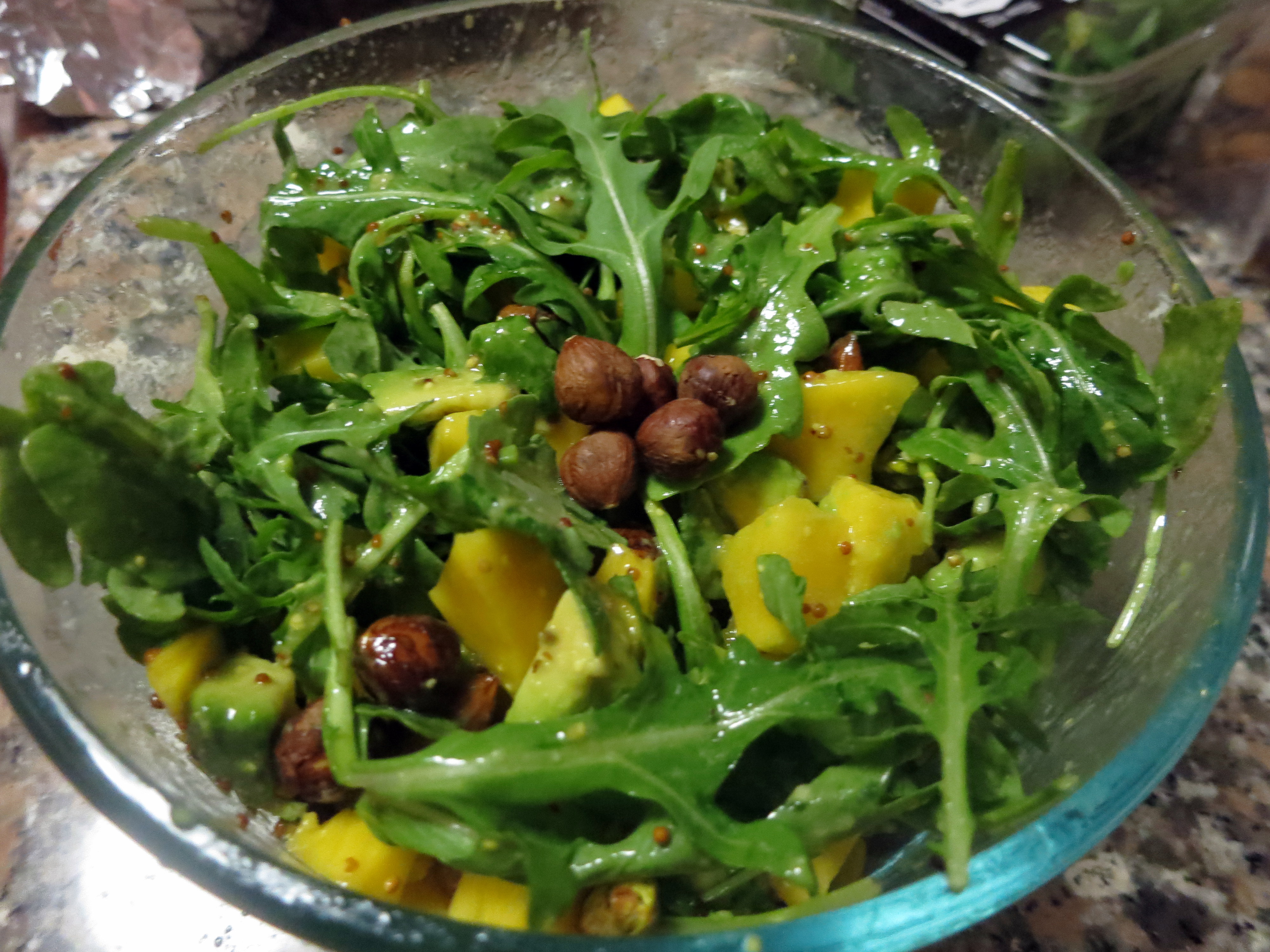 Combine all the salad ingredients and all dressing ingredients and mix to your liking. Some people like to mix the dressing in with avocado/mango combo and then pour over the greens to prevent the arugula from getting soggy. Others like to mix it all up (that’s what I did), so feel free to go nuts here! And enjoy! 🙂