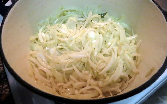 Melt the stick of butter in a large pot over medium heat. Add the onions, garlic, bay leaves, thyme, and salt and pepper and cook until the onions are very soft and caramelized, about 25 minutes.