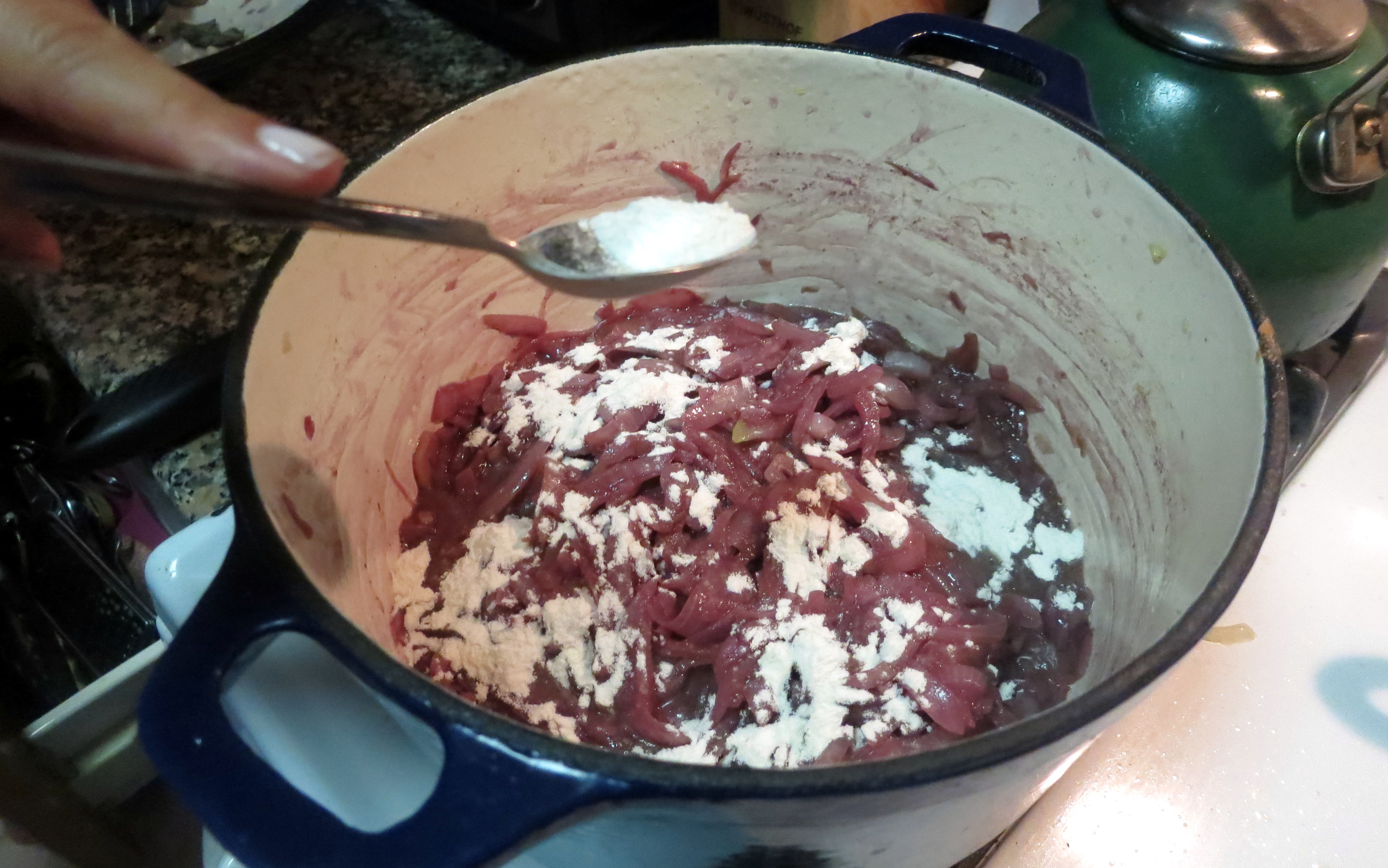 Add the wine, bring to a boil, reduce the heat and simmer until the wine has evaporated and the onions are dry, about 5 minutes. Discard the bay leaves and thyme sprigs. Dust the onions with the flour and give them a stir. Turn the heat down to medium low so the flour doesn’t burn, and cook for 10 minutes to cook out the raw flour taste.