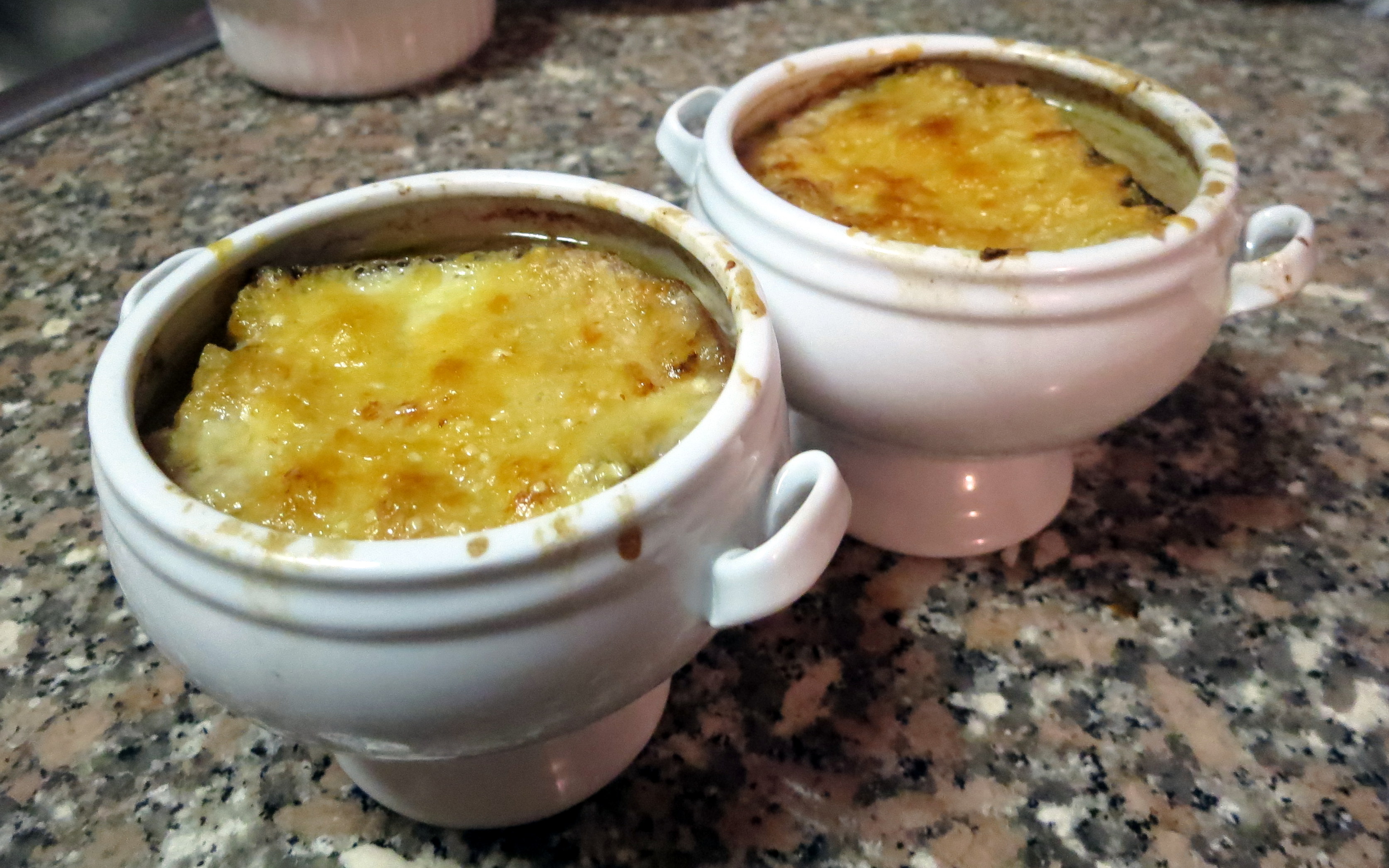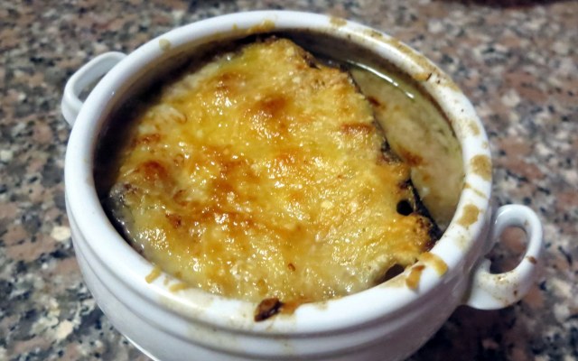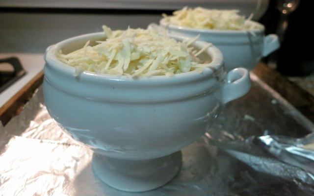 Alternative method: Ladle the soup into bowls, top each with 2 slices of bread and top with cheese. Put the bowls into the oven to toast the bread and melt the cheese. (This is what we did!)