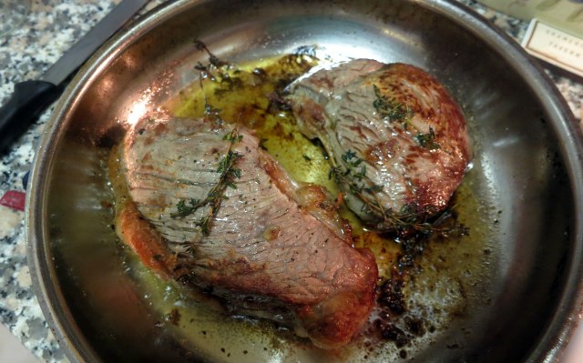 Preheat oven to 400*F. Now salt and pepper the steak to your liking. Heat oil/fat to as high of a temperature as possible. I also like to add thyme to my pan at this point. Sear the steak for about 1-2 minutes and then flip and let sear for another 30-60 seconds. Place the pan in the oven and roast for 5-8 minutes depending on thickness of the cut and your preference for doneness. Take out of the oven and let sit for 5-10 minutes (don’t underestimate this step!). Serve and enjoy!