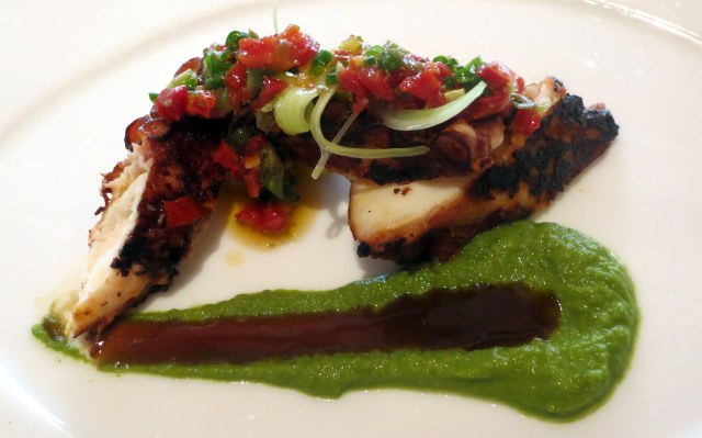 Charred Octopus “a la plancha”; Green Olive and Black Garlic Emulsion, Sundried Tomato Sauce Vierge