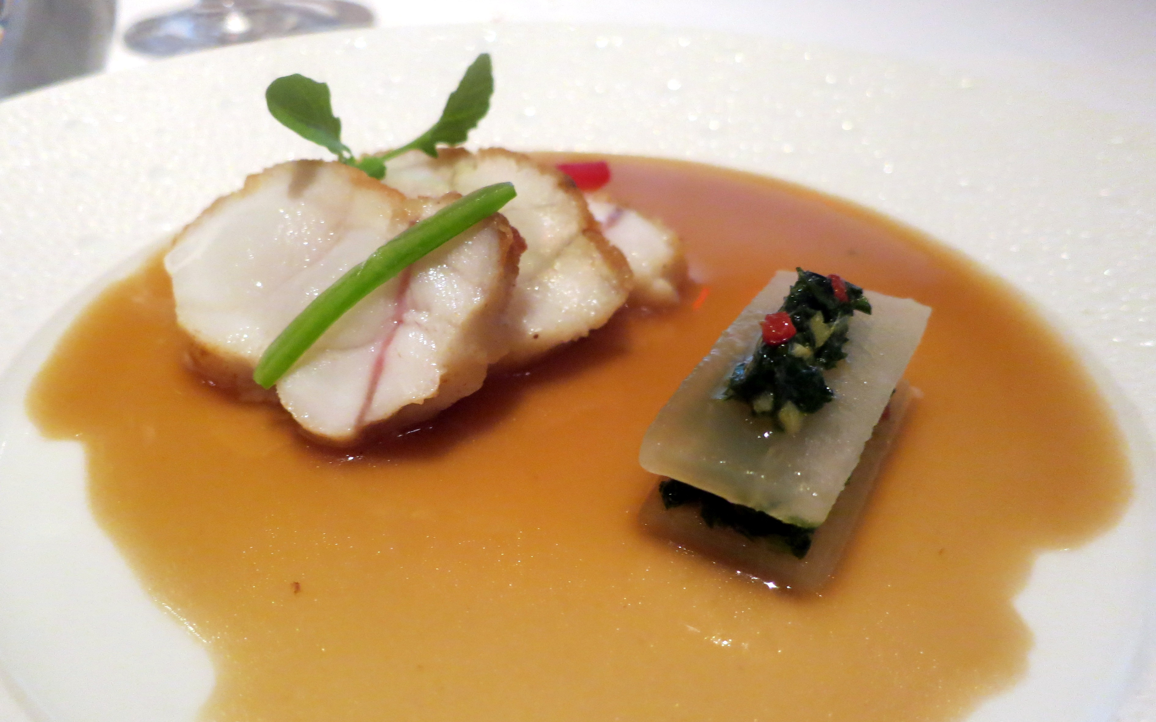 Roasted Monkfish; Wilted Mustard Greens-Daikon “Sandwich”, Adobo Sauce