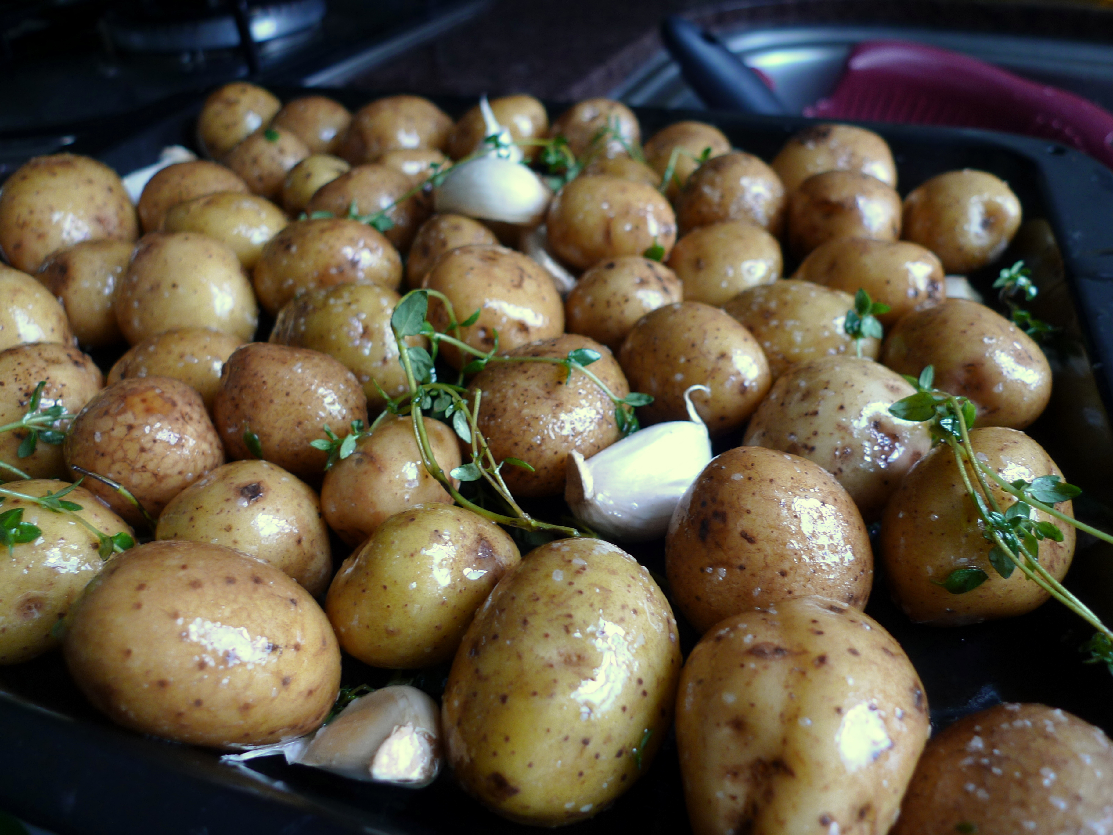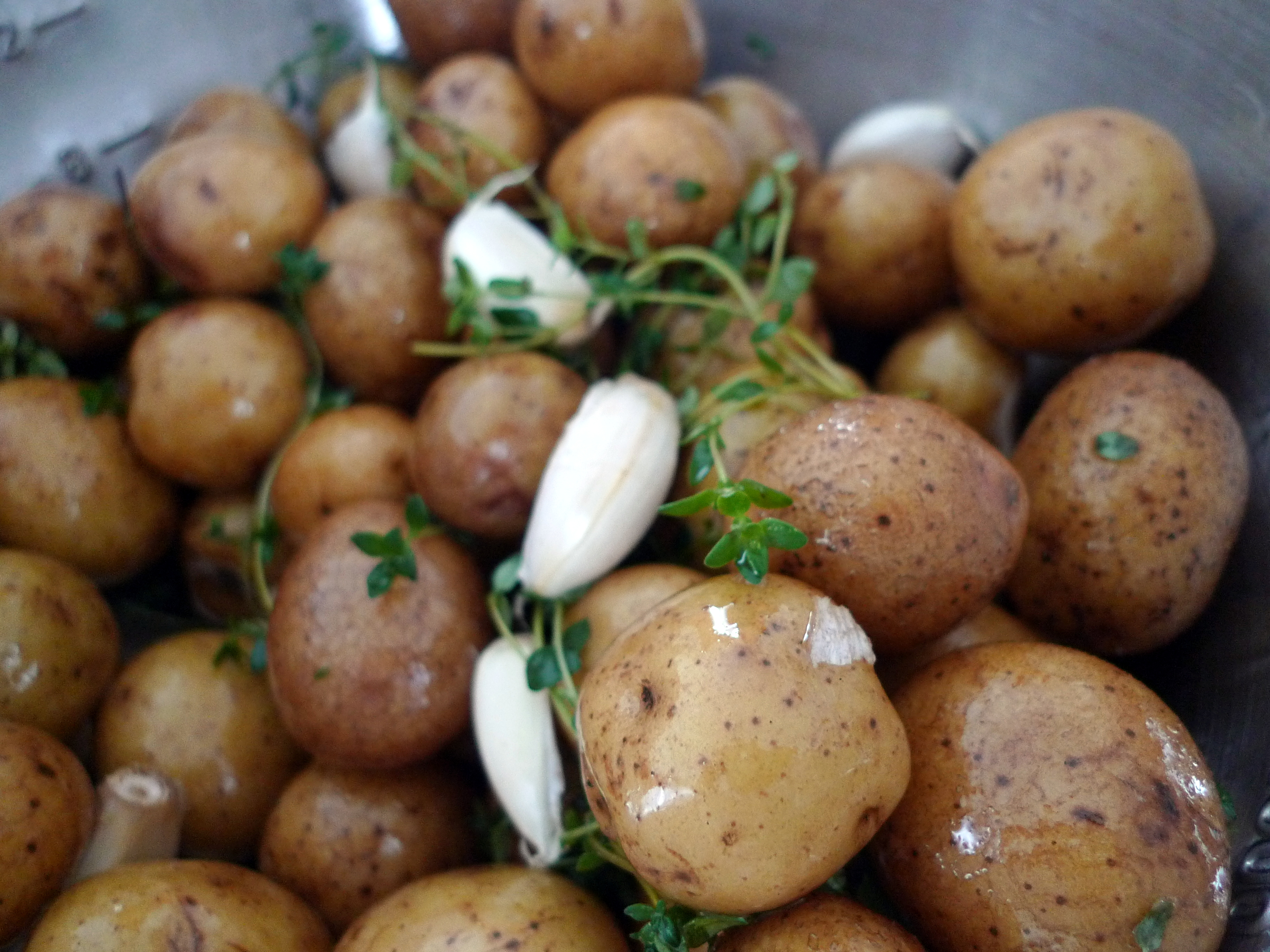 Toss the potatoes with 1/4 C canola oil, unpeeled garlic cloves, thyme, and salt to taste in a large bowl.