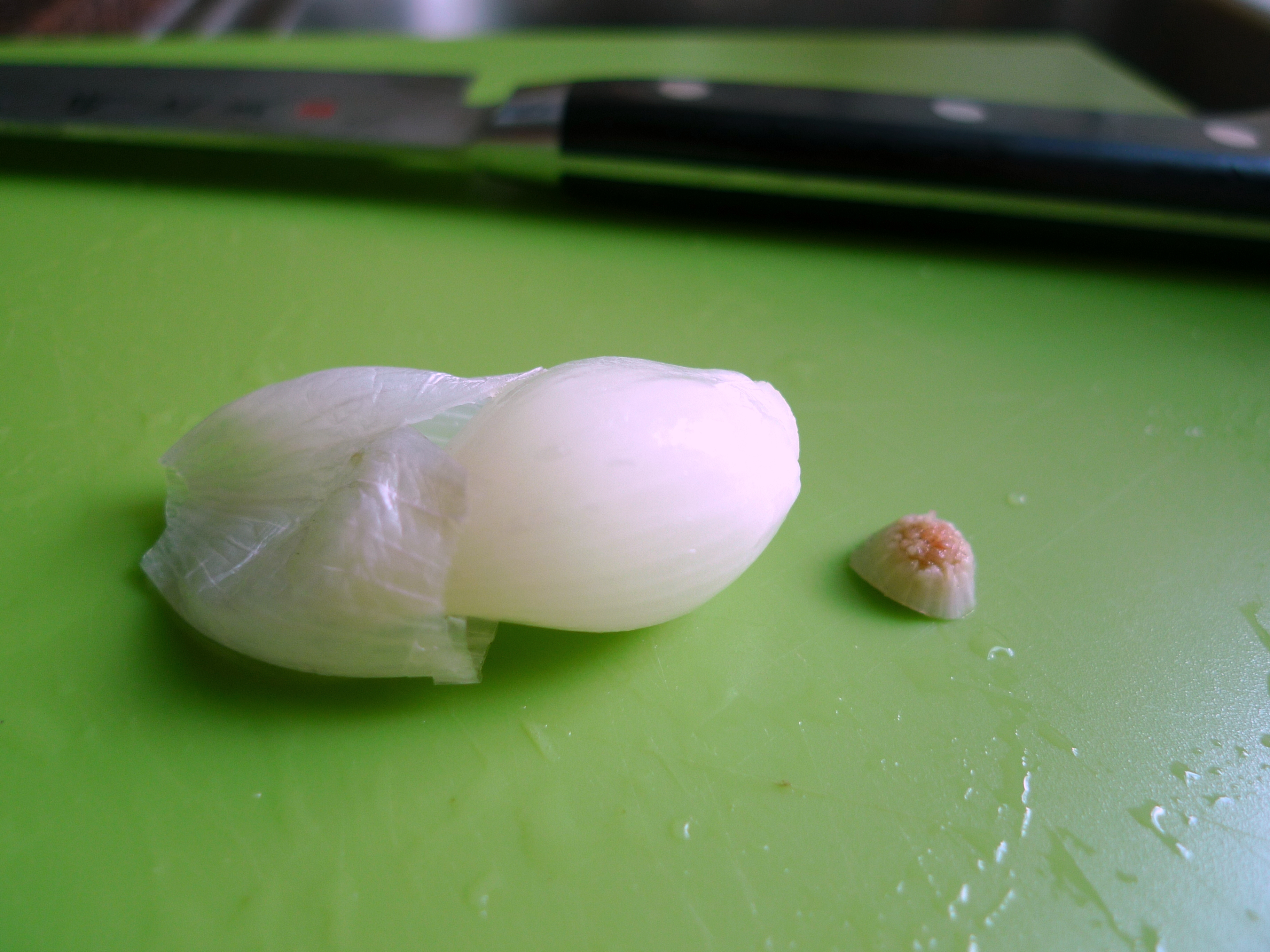 Trim the root ends and pinch the stem end of each until the peeled onion pops out. Ta-da!