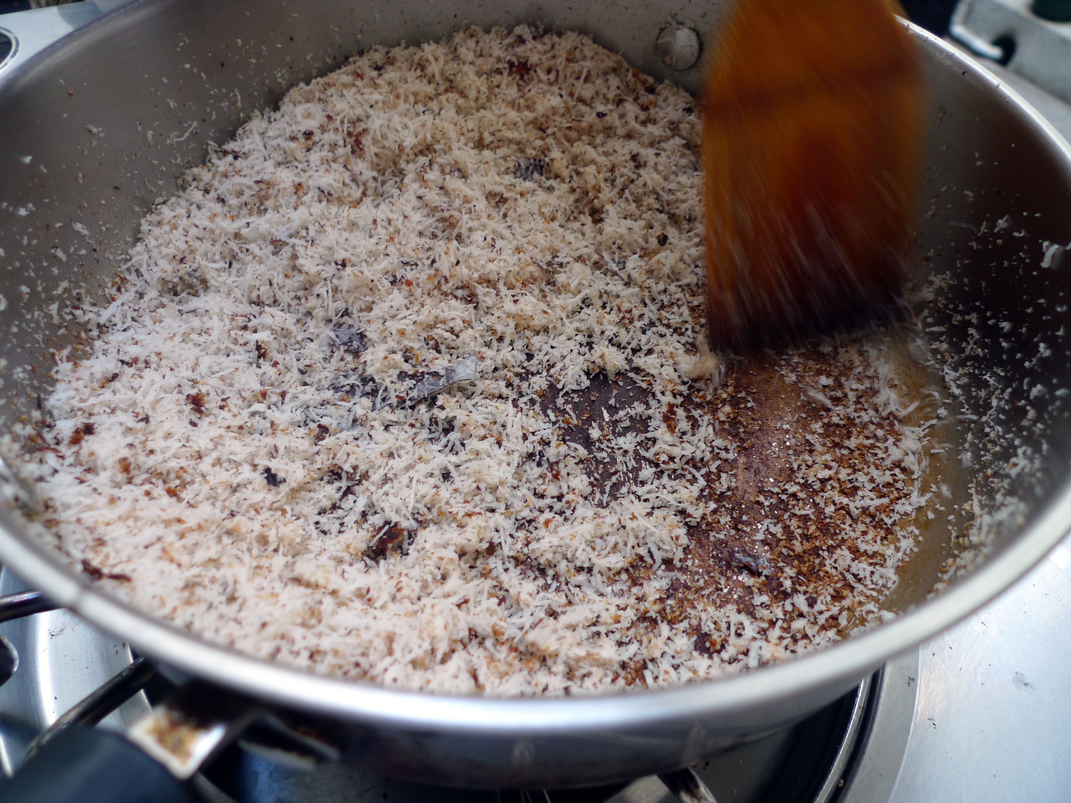 Use a stainless steel wok with a heavy base and heat over a very slow fire. Add the grated coconut and continually stir until it becomes a even, deep golden brown color. It should take about ten minutes.