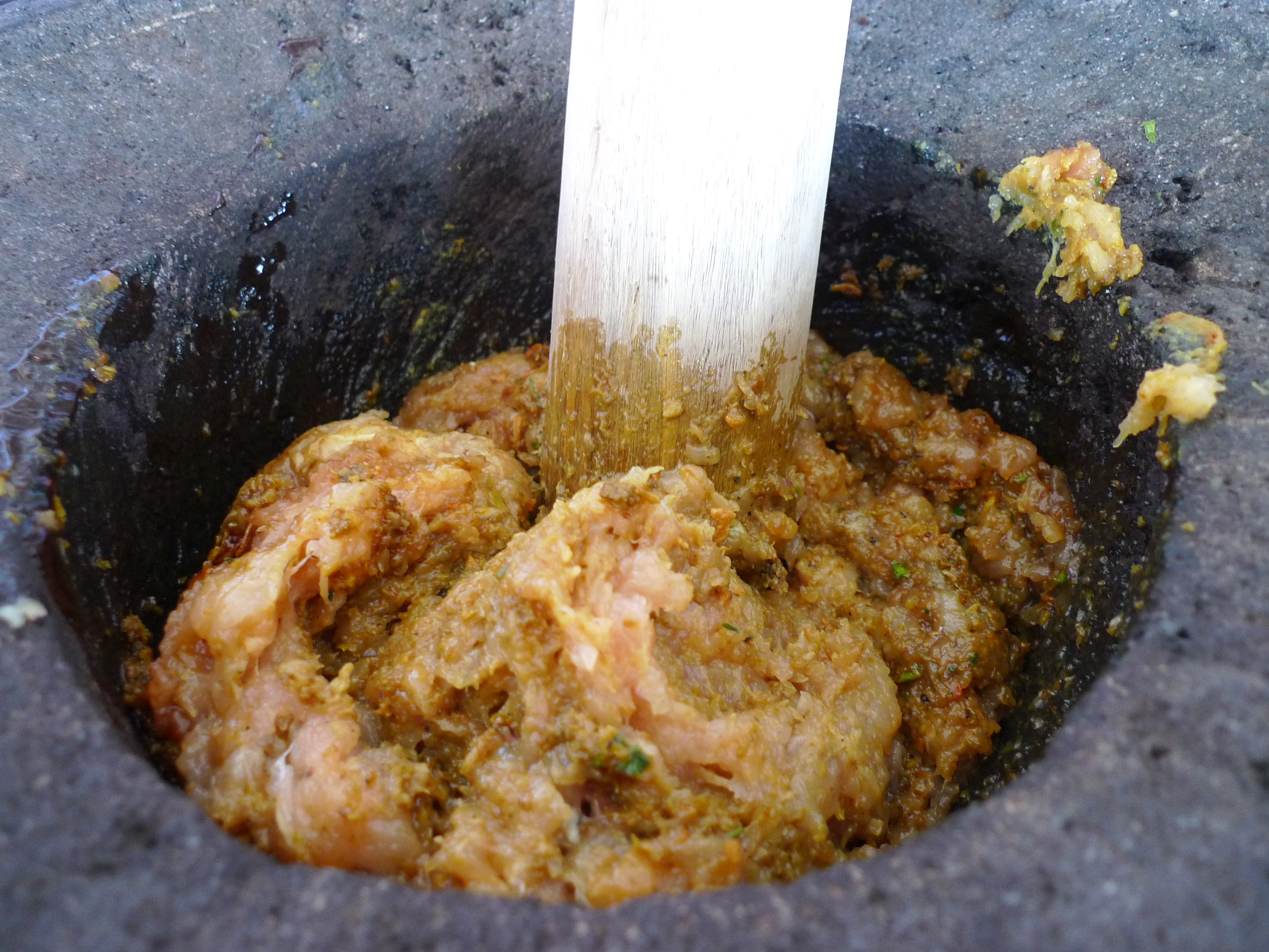 Combine all of the ingredients above, except for the banana leaves, mixing well. During class, we used a giant mortar and pestle to pound the chicken into a paste mixture.