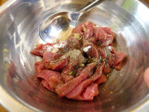 Slice the meat into thin strips of about 1cm x 0.5cm x 4cm (size of your little finger).