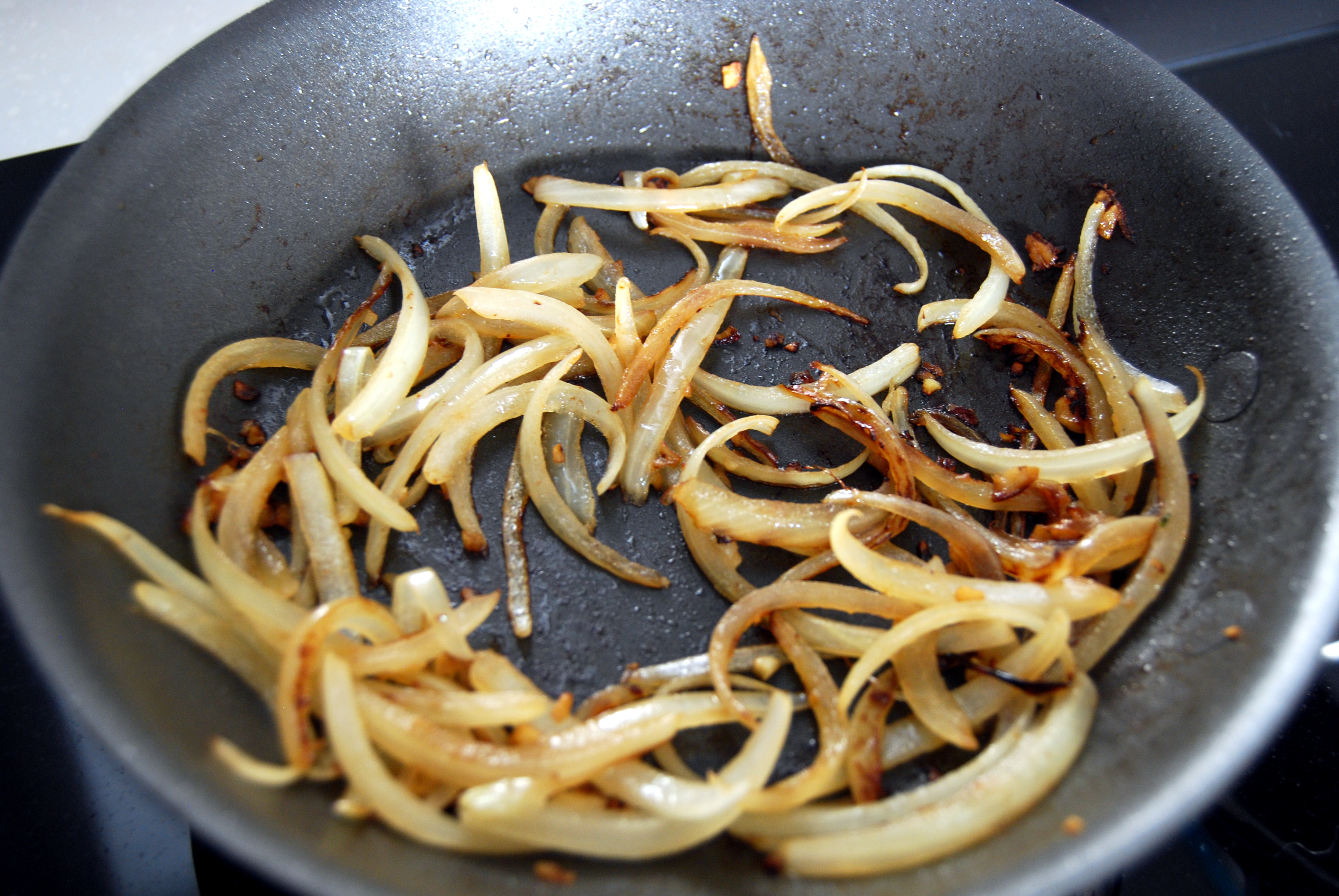 In a medium skillet, heat 1 tablespoon of the olive oil. Add the onion and garlice, season with salt and pepper. Cover and cook over moderate heat, stirring occasionally, until golden brown, about 10 minutes. Let cool.