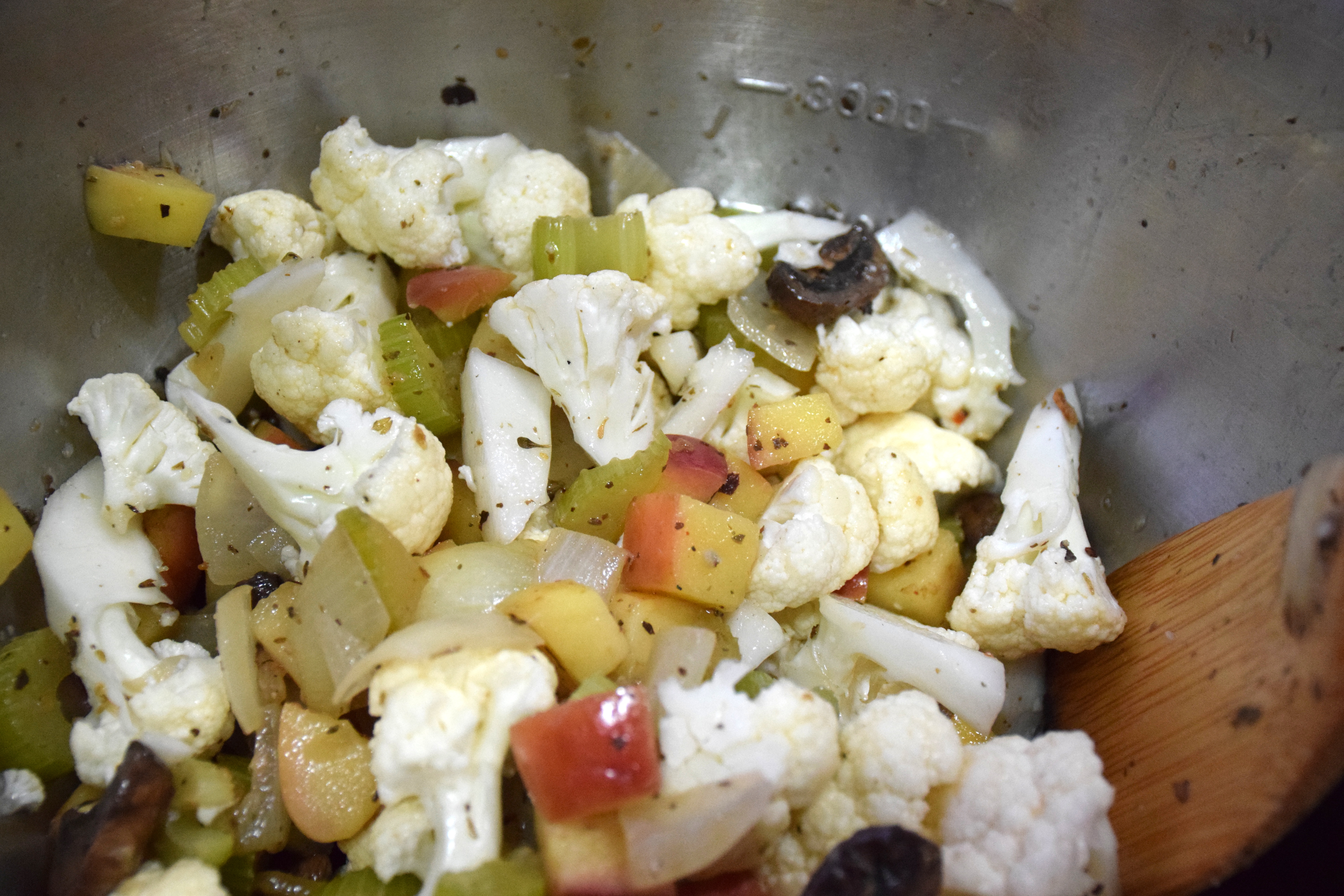 In a sauté pan over medium heat, heat 2 T olive oil and add the celery.  Cook for about 2 minutes until it just begins to soften (about 2 minutes) and then add the onion and apples.  Cook for two minutes, continue to stir frequently.  Add the mushrooms.  Cook until the vegetables and fruit are soft and aromatic.  Remove from heat and combine with the cauliflower florets.