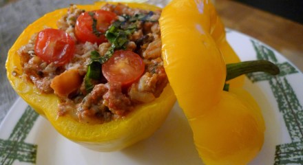 Baked Peppers Stuffed with Ground Beef, Wild Rice & Goat Cheese